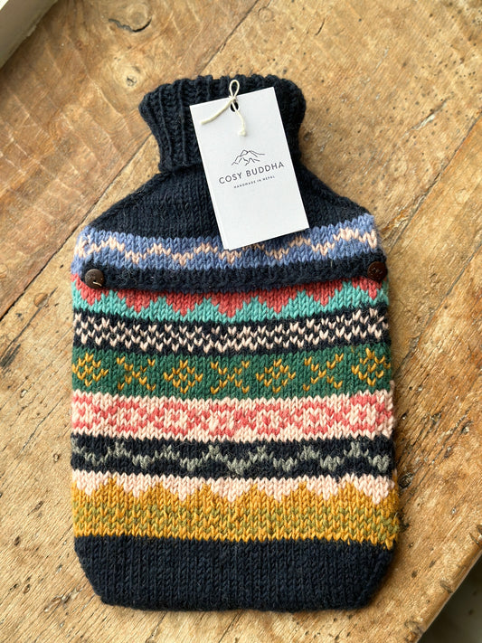 Dark Blue, Coral & Ochre Hand Knitted Fair Isle Hot Water Bottle