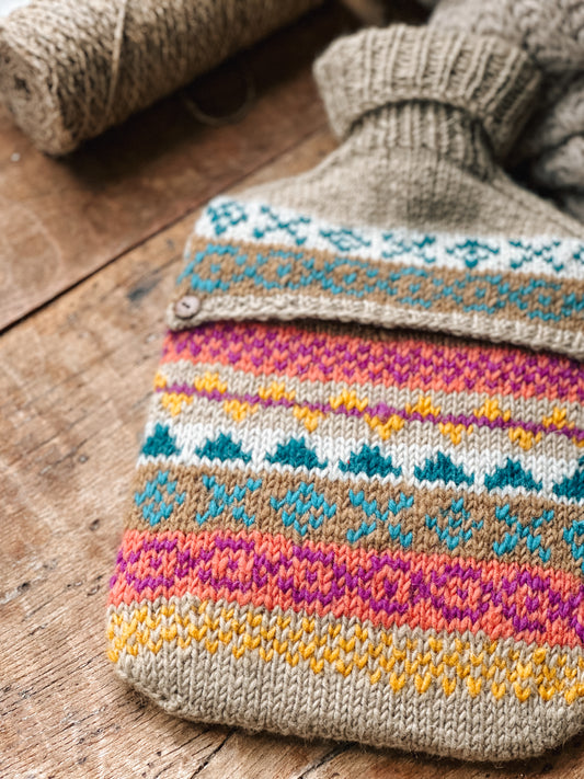 Oatmeal, Coral and Teal Hand Knitted Fair Isle Hot Water Bottle