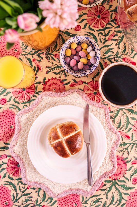 Saffron & Pink Zinnia Hand Block Printed Table Cloth