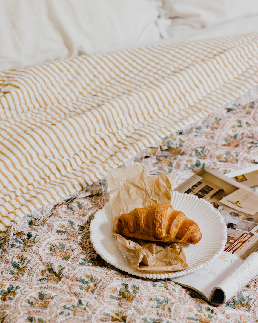 Each quilt is printed, quilted and finished by hand in small batches in Jaipur, then gently trimmed with a soft ruffle edge.