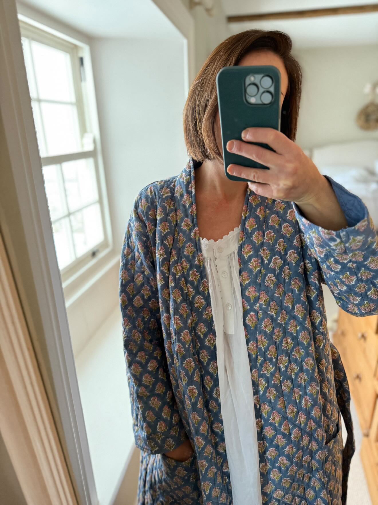Each quilted dressing gown is hand block printed and quilted by master artisans in Jaipur, India, making every gown as unique as it is beautiful.