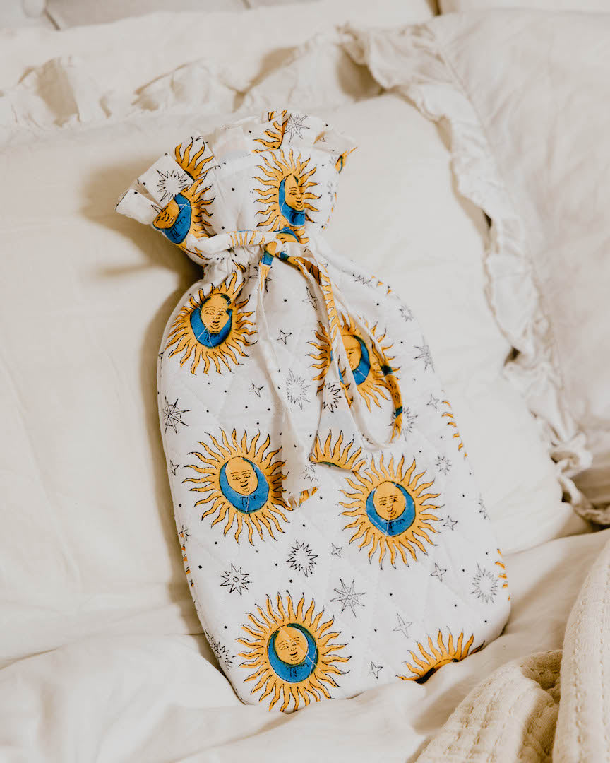 Crafted from soft, block-printed cotton and lightly quilted for a gentle, padded feel. These hot water bottle covers feature a simple tie fastening and ruffled edge detail on the neck.